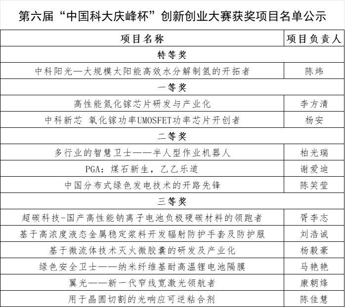 5月19日,第六届“中国科大庆峰杯”创新创业大赛决赛成功举行。经资格审查、初赛复赛、决赛路演答辩及专家评审合议等环节,现将本届大赛获奖项目公示如下(同等奖项排名不分先后,按项目名称首字母排序):