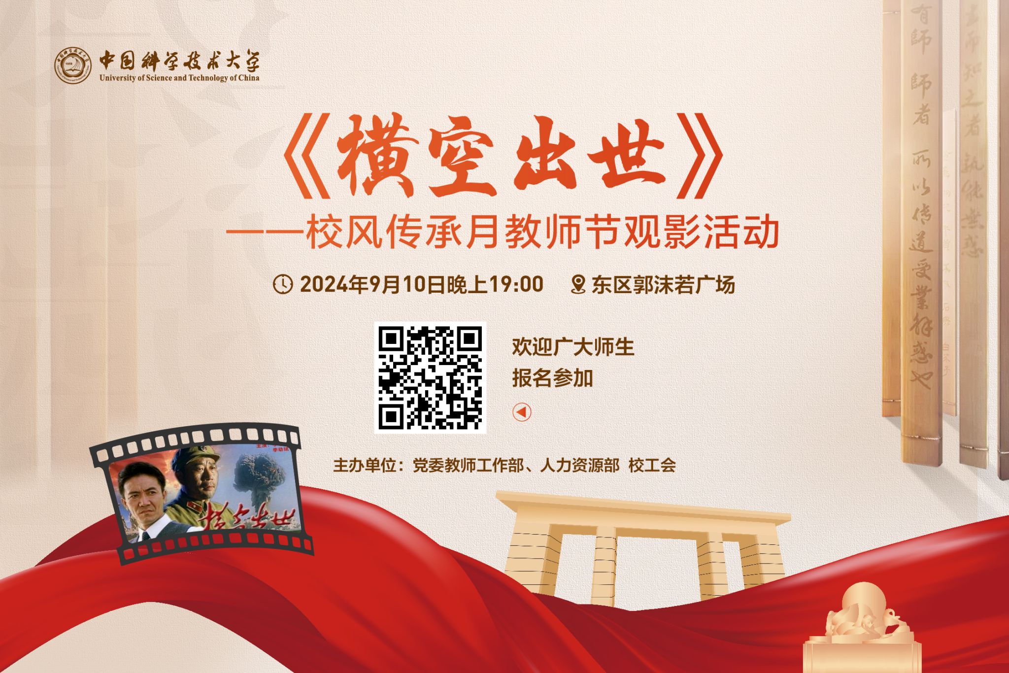 三、学校定于9月10日晚上19:00,在东区郭沫若广场举行教师节露天观影活动,组织师生集体观看《横空出世》,欢迎广大师生以个人或者集体名义报名参加,报名通过者将预留座位。因场地有限,欲报从速,请于9月8日前点击链接报名:https://www.wjx.cn/vm/mezLxLh.aspx#。