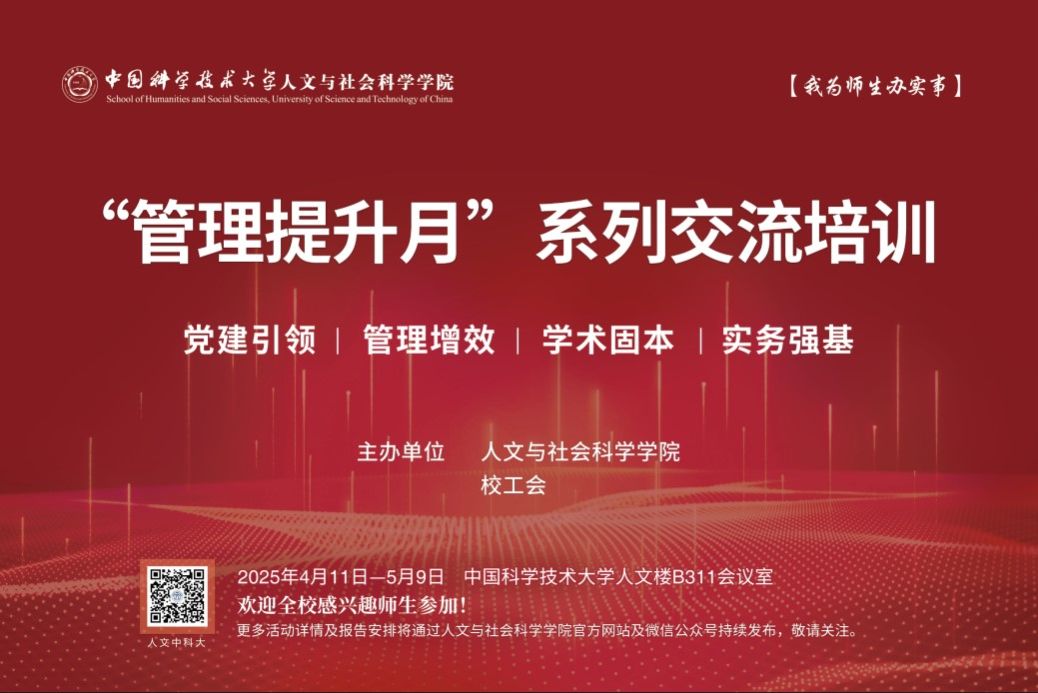 为进一步提升管理效能、强化服务意识,人文与社会科学学院联合校工会共同举办“管理提升月”系列交流培训活动。本次活动将邀请全校相关机关部门负责同志开展专题报告,共16场。旨在通过党建引领、管理增效、学术固本、实务强基等方面的交流培训促进跨单位协作、提升管理能力。现将有关事项通知如下: